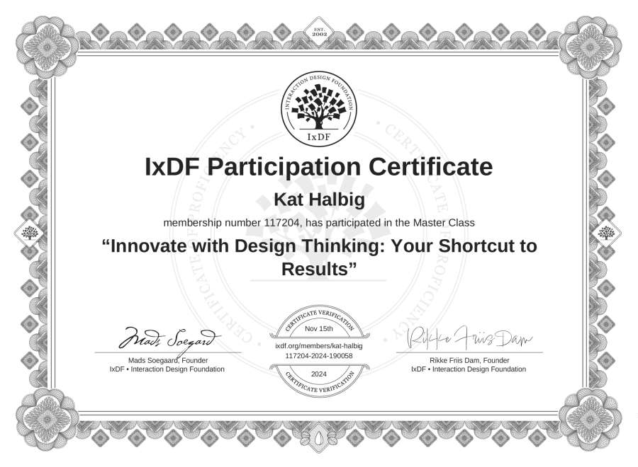 Kat Halbig's IxDF Masterclass Certificate: Innovate with Design Thinking: Your Shortcut to Results