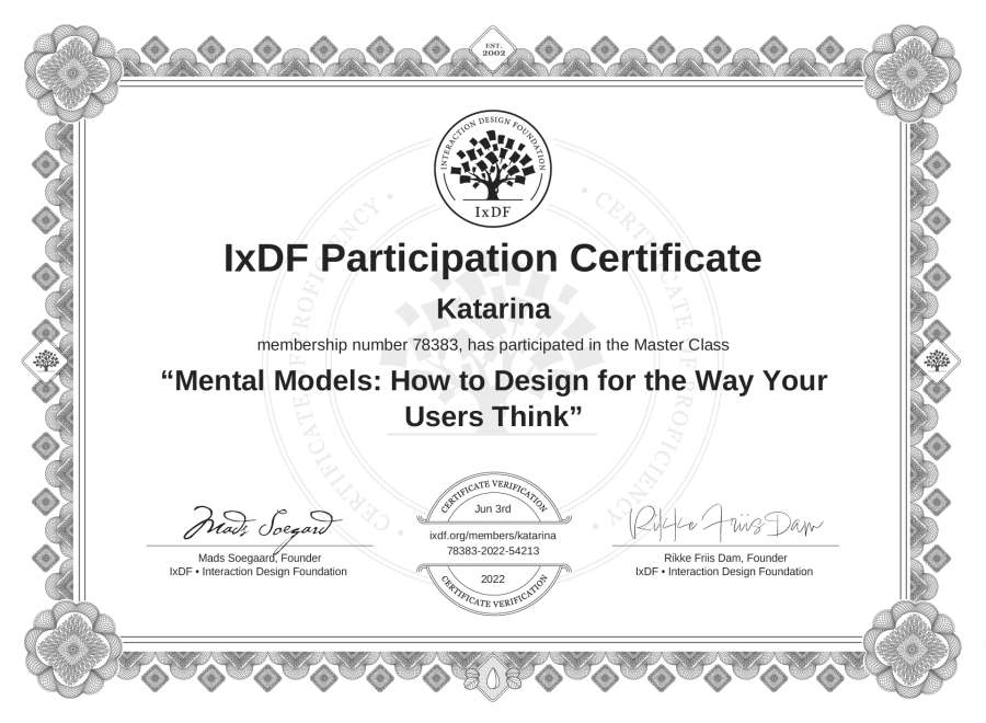 Katarina's IxDF Masterclass Certificate: Mental Models: How to Design for the Way Your Users Think