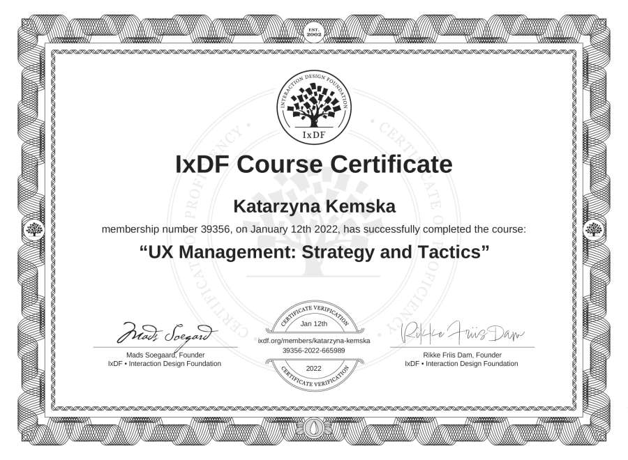Katarzyna Kemska's IxDF Course Certificate: UX Management: Strategy and Tactics