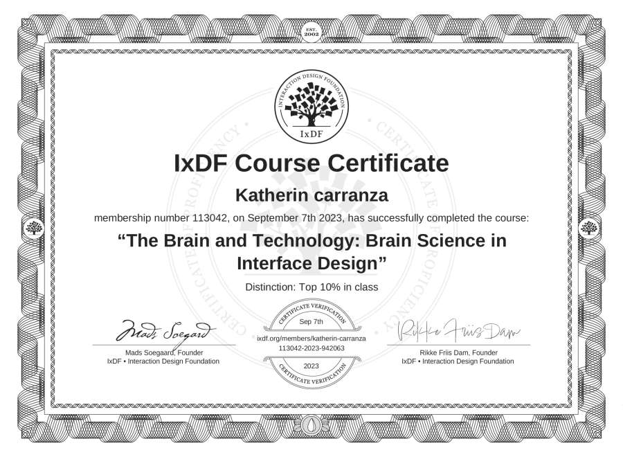 Katherin carranza's IxDF Course Certificate: The Brain and Technology: Brain Science in Interface Design