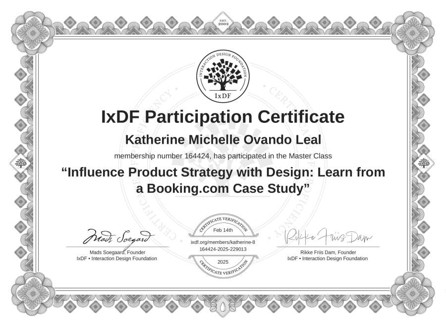 Katherine Michelle Ovando Leal's IxDF Masterclass Certificate: Influence Product Strategy with Design: Learn from a Booking.com Case Study