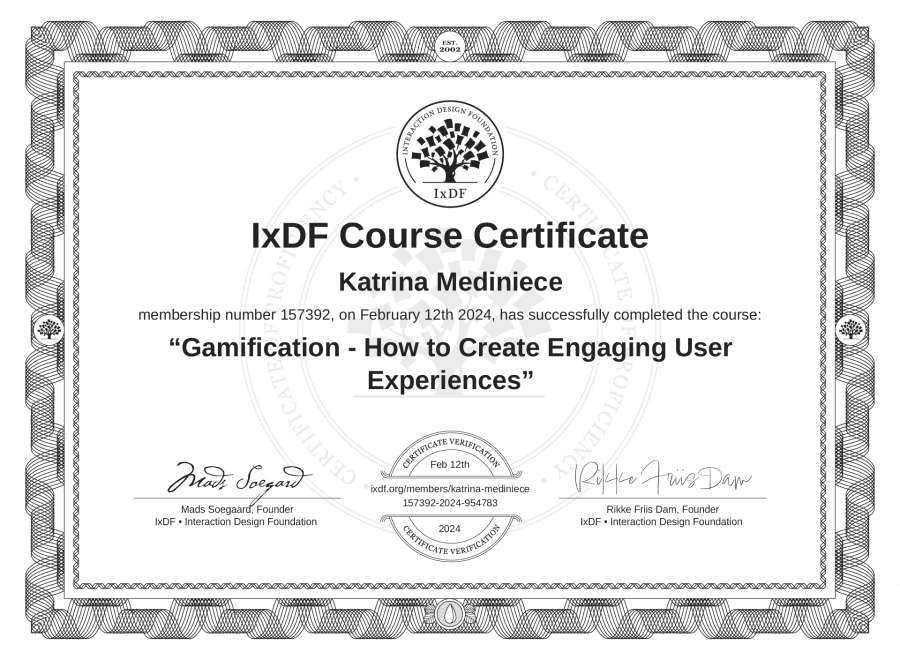 Katrina Mediniece's IxDF Course Certificate: Gamification - How to Create Engaging User Experiences