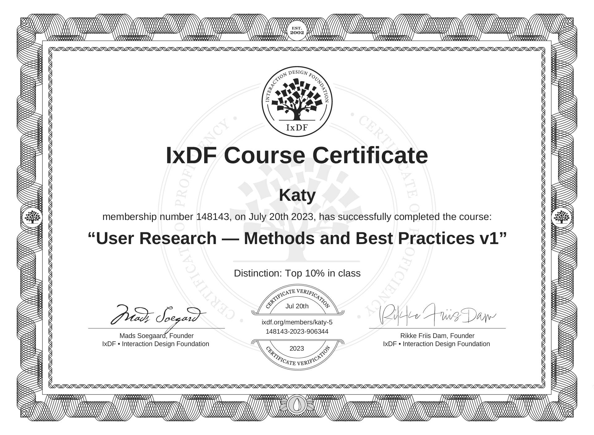 The IxDF Course Certificate above is awarded to Katy with a Top 10% Distinction in formal recognition of their coursework surpassing the rigorous benchmarks of exceptional performance established by the IxDF Educational Codex.