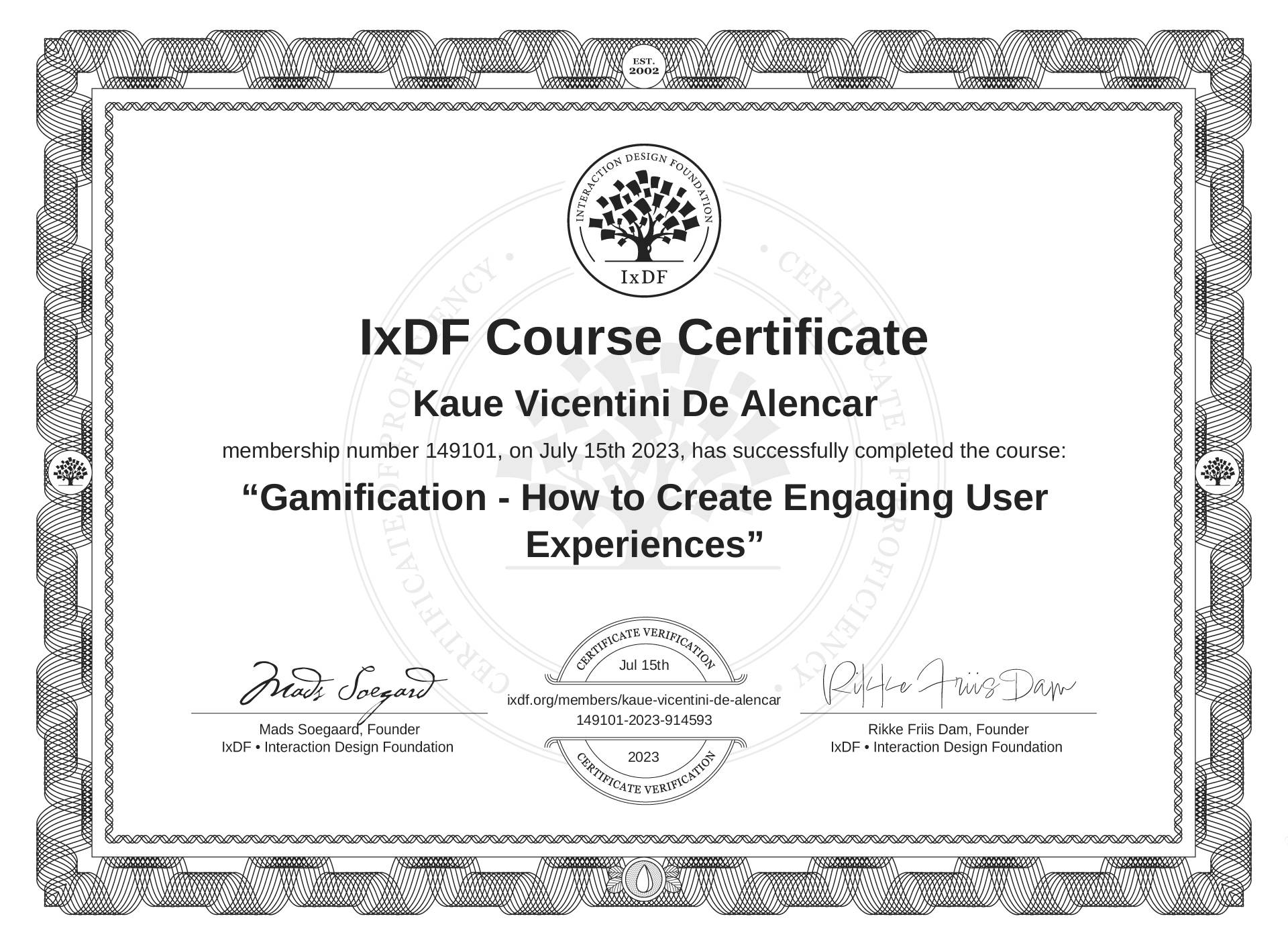 Kaue Vicentini De Alencar's IxDF Course Certificate: Gamification - How to Create Engaging User Experiences