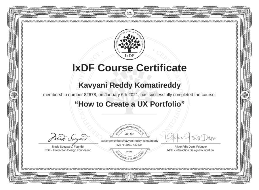 Kavyani Reddy Komatireddy's IxDF Course Certificate: How to Create a UX Portfolio