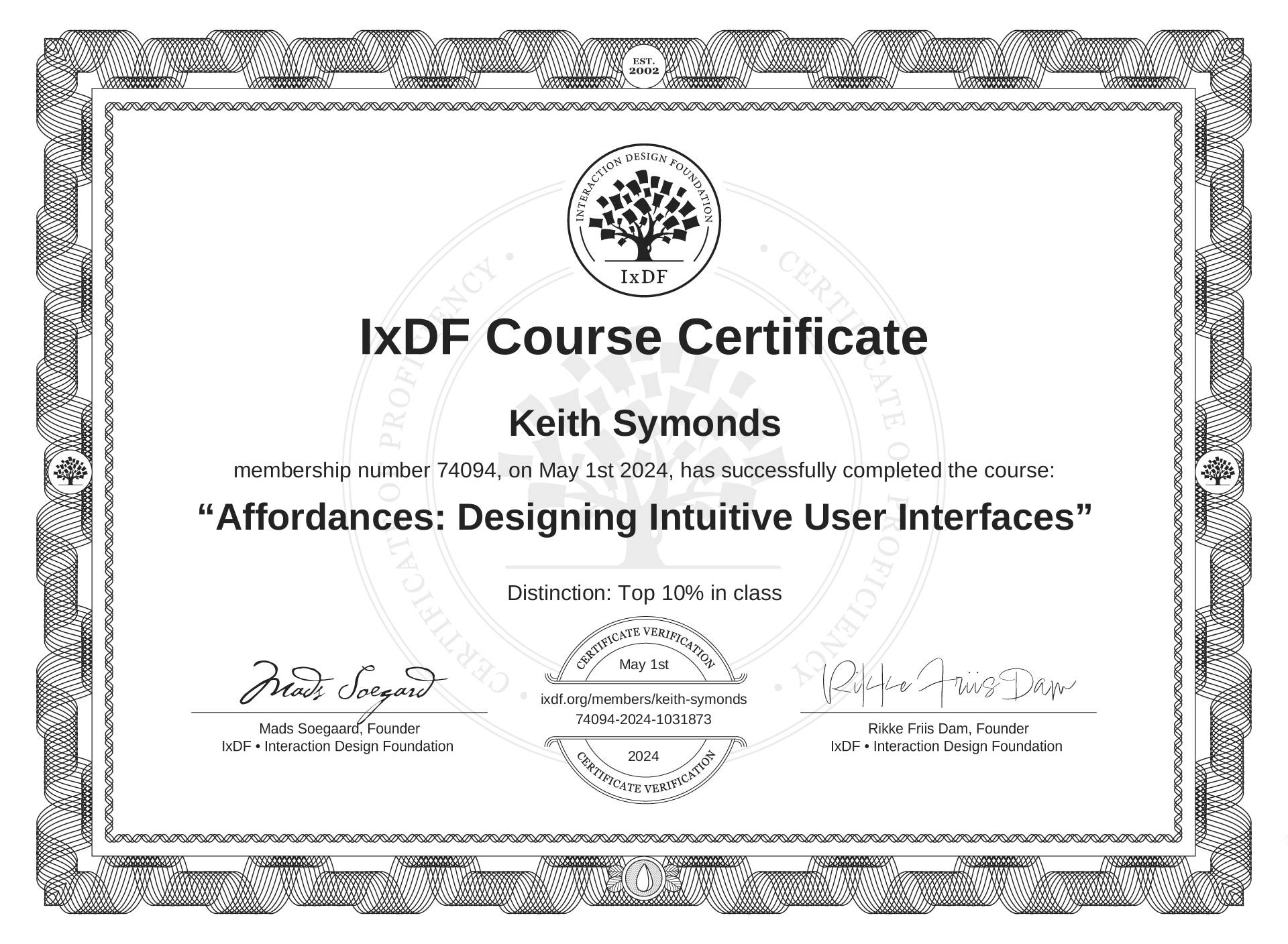 The IxDF Course Certificate above is awarded to Keith Symonds with a Top 10% Distinction in formal recognition of their coursework surpassing the rigorous benchmarks of exceptional performance established by the IxDF Educational Codex.