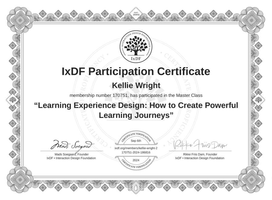Kellie Wright's IxDF Masterclass Certificate: Learning Experience Design: How to Create Powerful Learning Journeys