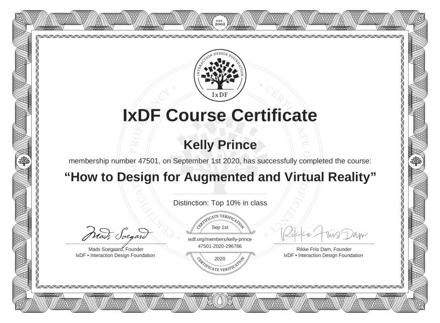 Kelly Prince's IxDF Course Certificate: How to Design for Augmented and Virtual Reality
