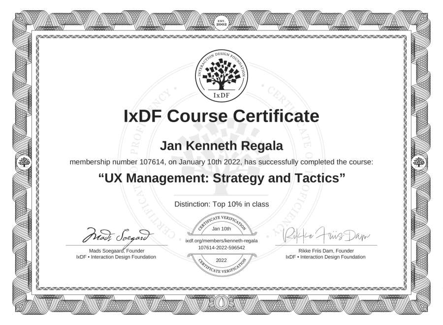 The IxDF Course Certificate above is awarded to Jan Kenneth Regala with a Top 10% Distinction in formal recognition of their coursework surpassing the rigorous benchmarks of exceptional performance established by the IxDF Educational Codex.