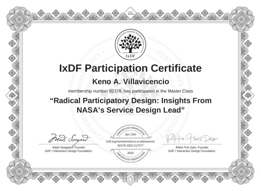 Keno A. Villavicencio's IxDF Masterclass Certificate: Radical Participatory Design: Insights From NASA’s Service Design Lead