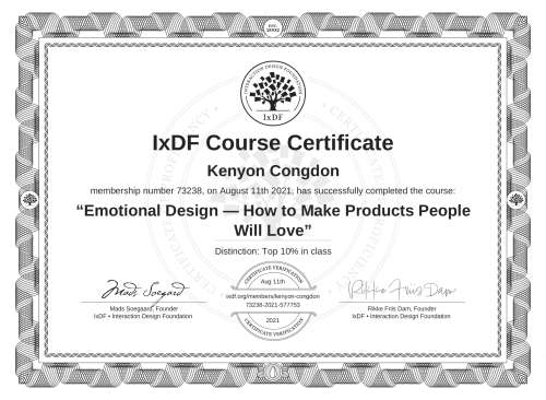 IxDF Course Certificates are awarded to Kenyon Congdon in formal recognition of their coursework surpassing the rigorous benchmarks of exceptional performance established by the IxDF Educational Codex.