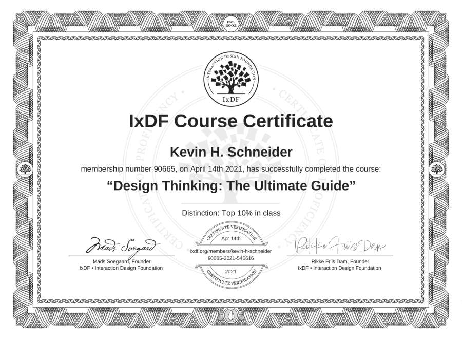 The IxDF Course Certificate above is awarded to Kevin H. Schneider with a Top 10% Distinction in formal recognition of their coursework surpassing the rigorous benchmarks of exceptional performance established by the IxDF Educational Codex.