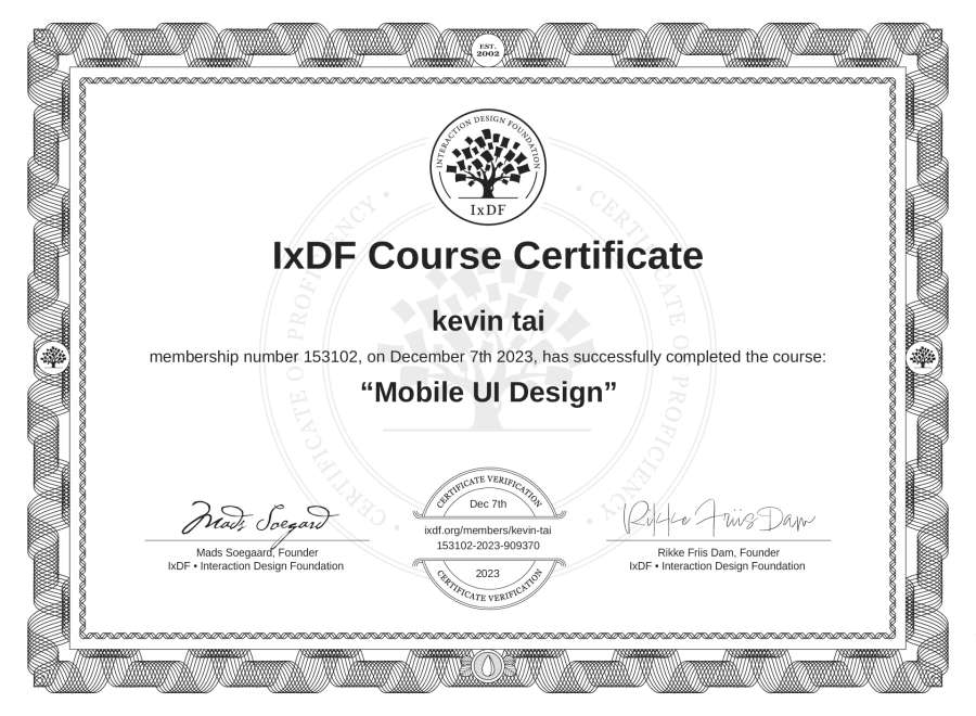 The IxDF Course Certificate above is awarded to kevin tai in formal recognition of their coursework surpassing the rigorous benchmarks of exceptional performance established by the IxDF Educational Codex.