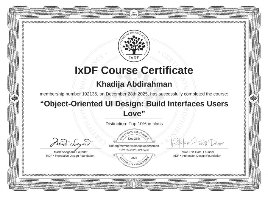 Khadija Abdirahman's IxDF Course Certificate: Object-Oriented UI Design: Build Interfaces Users Love