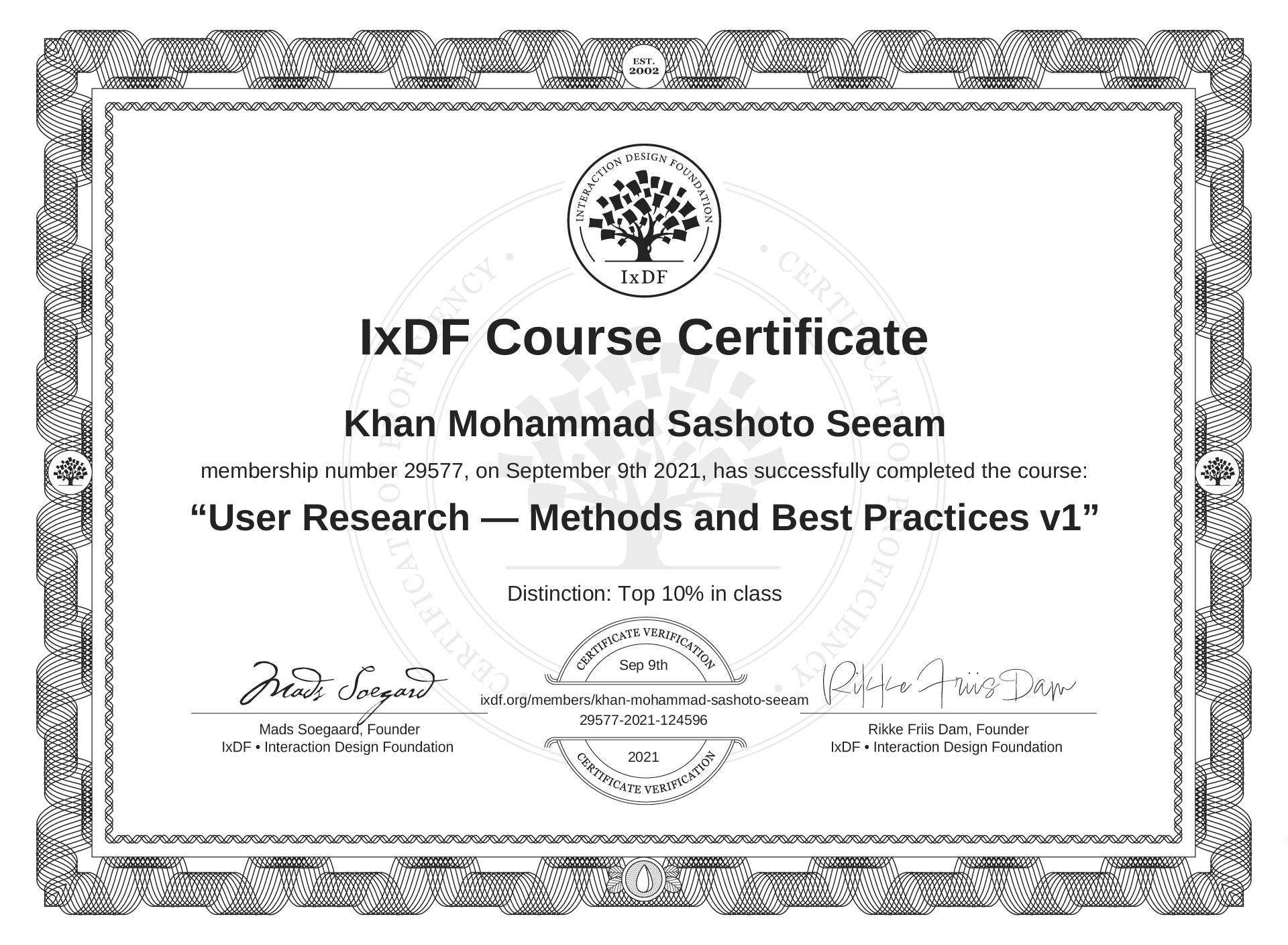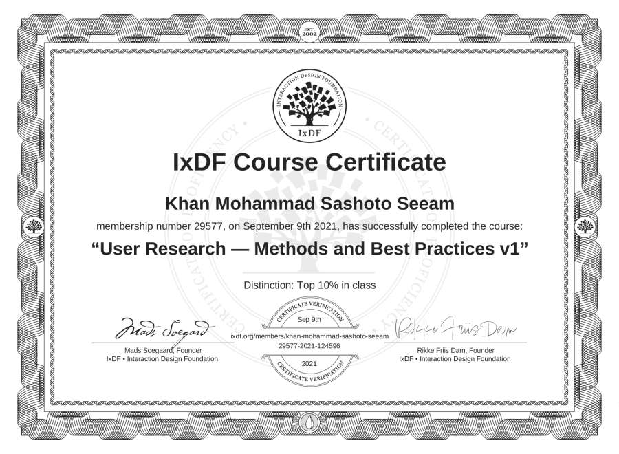 Khan Mohammad Sashoto Seeam's IxDF Course Certificate: User Research — Methods and Best Practices v1