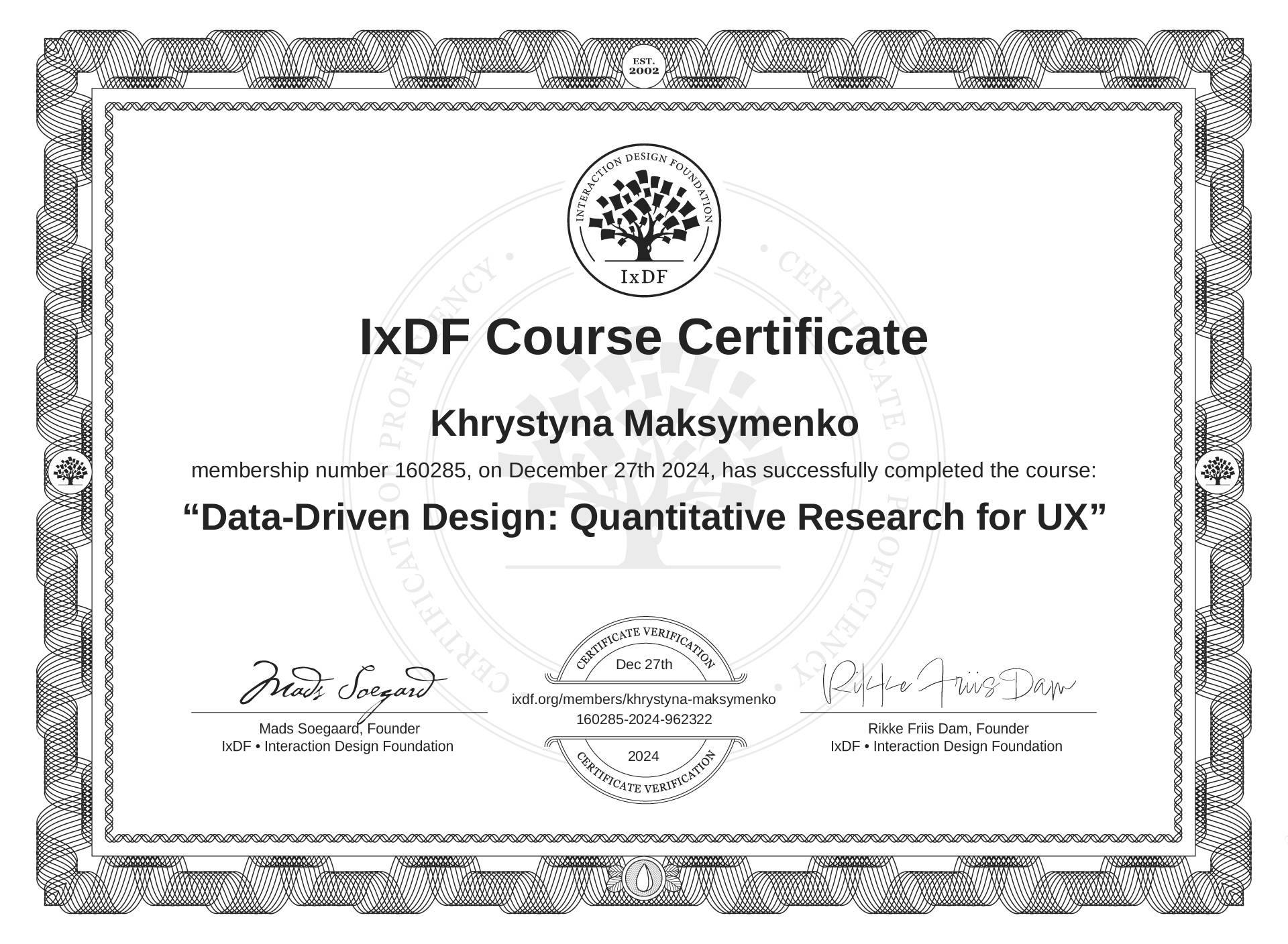 Khrystyna Maksymenko's IxDF Course Certificate: Data-Driven Design: Quantitative Research for UX