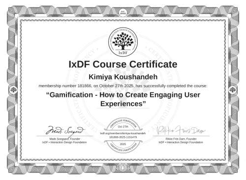 IxDF Course Certificates are awarded to Kimiya Koushandeh in formal recognition of their coursework surpassing the rigorous benchmarks of exceptional performance established by the IxDF Educational Codex.