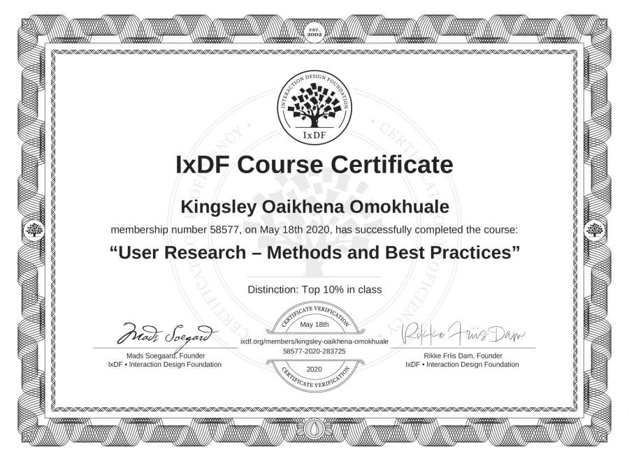 Kingsley Oaikhena Omokhuale's IxDF Course Certificate: User Research – Methods and Best Practices