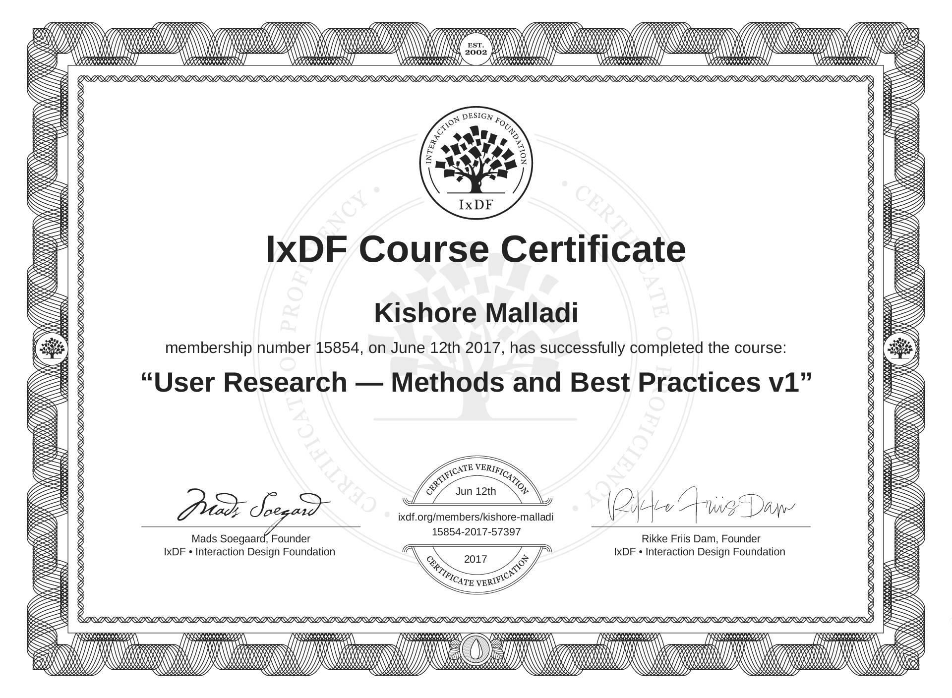 Kishore Malladi's IxDF Course Certificate: User Research — Methods and Best Practices v1