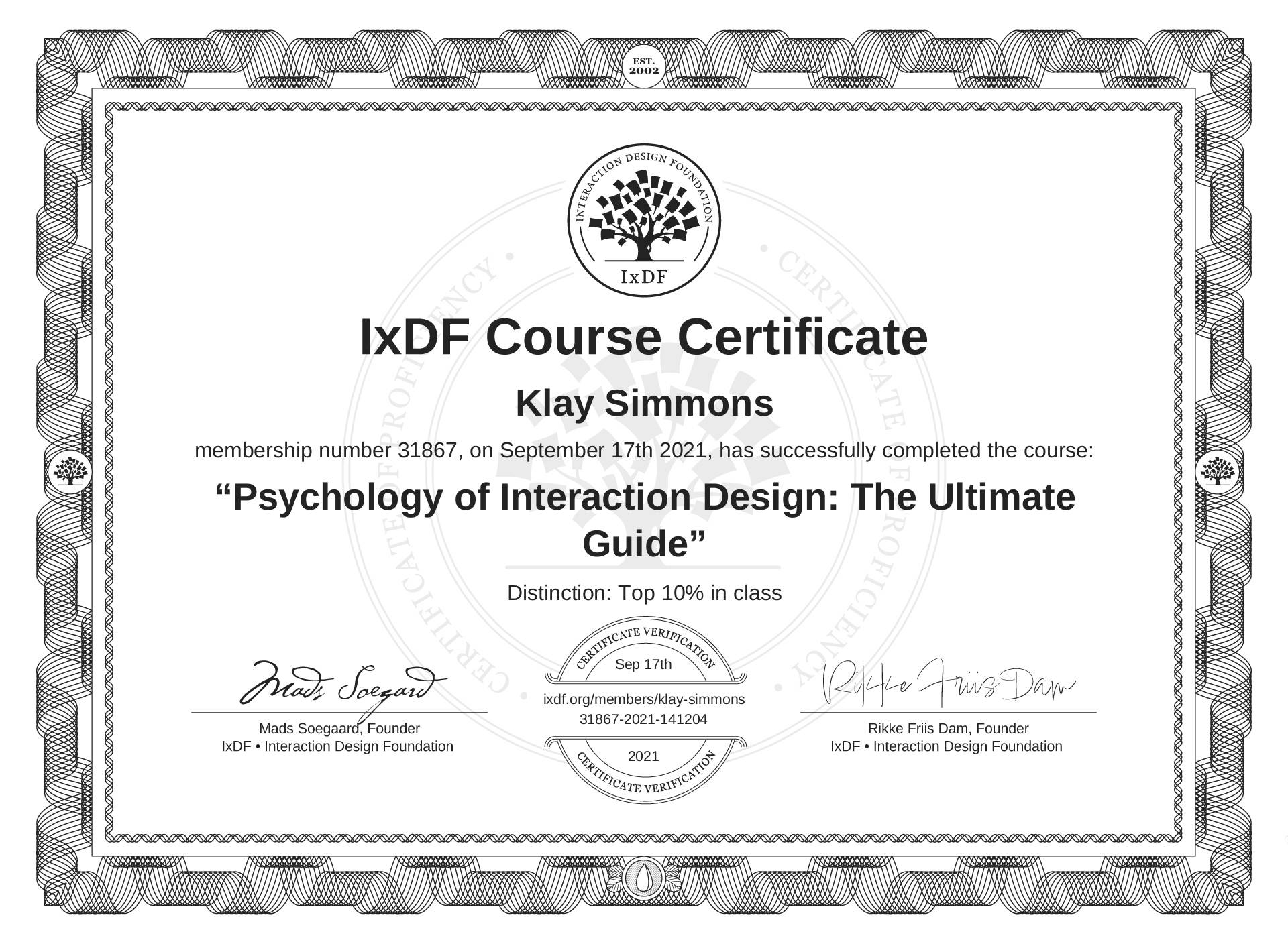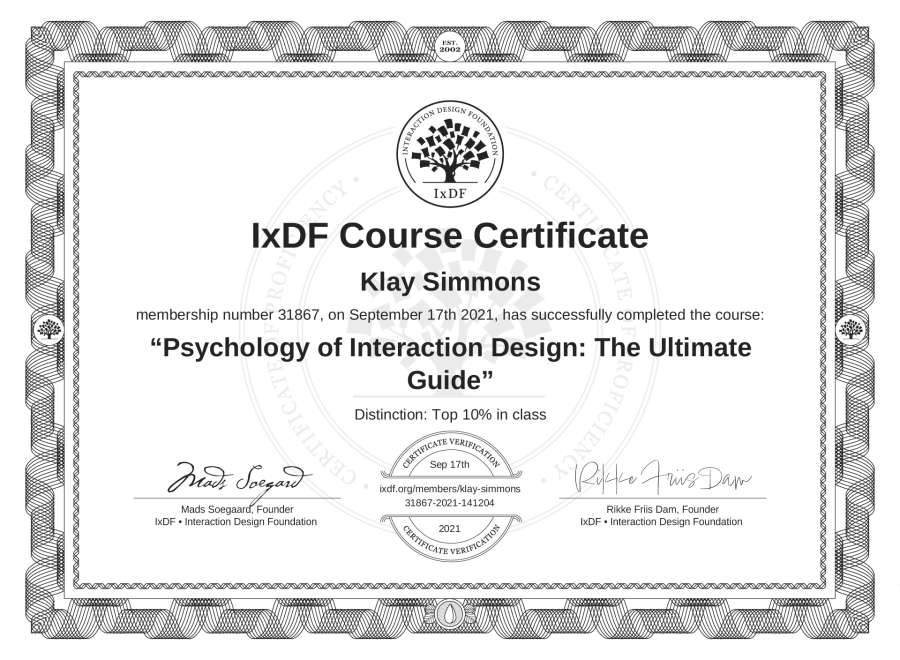 Klay Simmons's IxDF Course Certificate: Psychology of Interaction Design: The Ultimate Guide