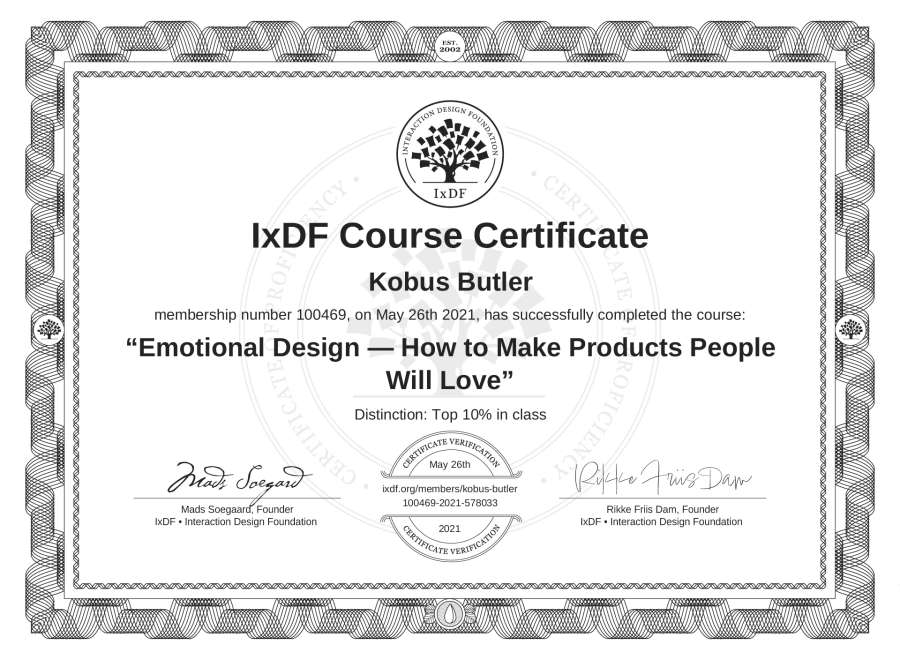 Kobus Butler's IxDF Course Certificate: Emotional Design — How to Make Products People Will Love