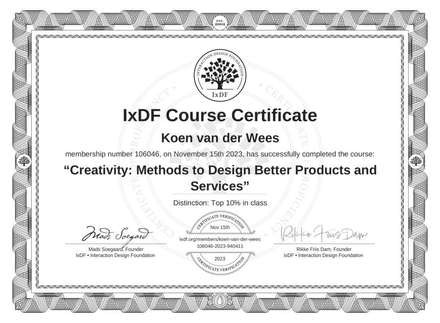 Koen van der Wees's IxDF Course Certificate: Creativity: Methods to Design Better Products and Services