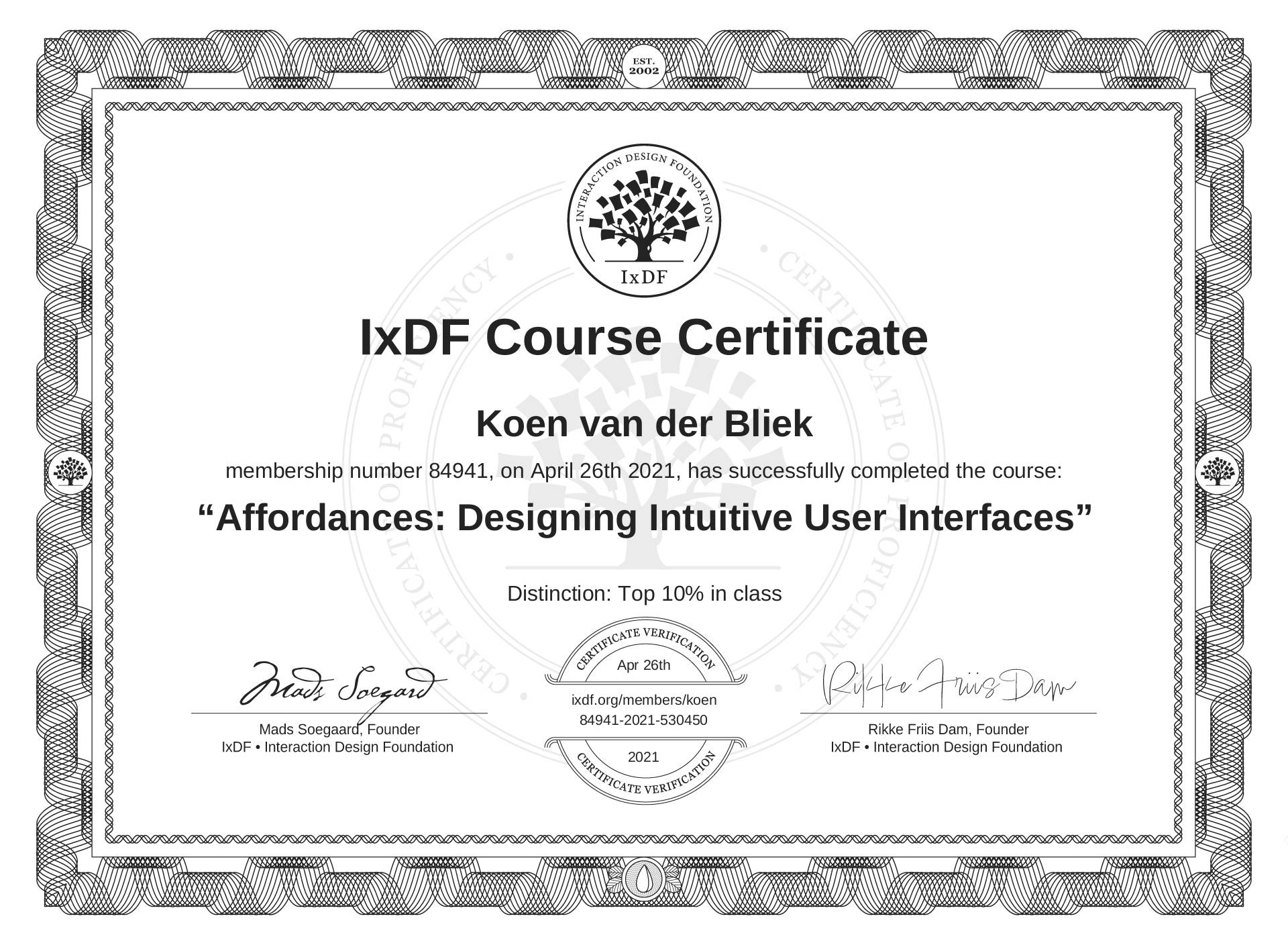 The IxDF Course Certificate above is awarded to Koen van der Bliek with a Top 10% Distinction in formal recognition of their coursework surpassing the rigorous benchmarks of exceptional performance established by the IxDF Educational Codex.