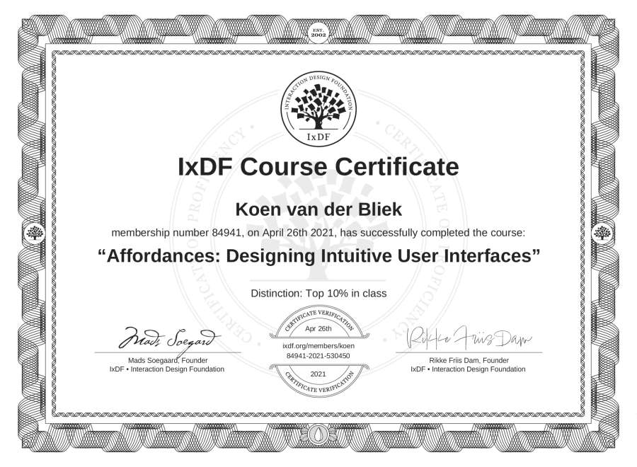 Koen van der Bliek's IxDF Course Certificate: Affordances: Designing Intuitive User Interfaces