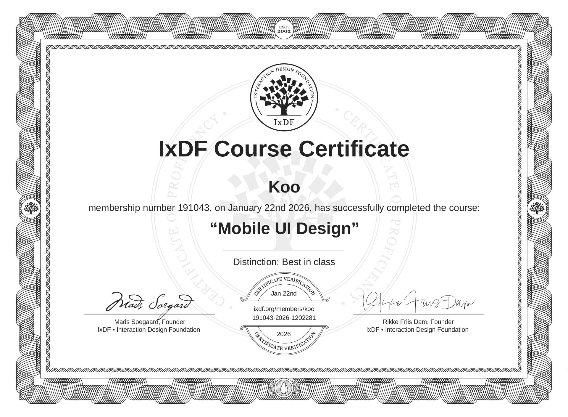 The IxDF Course Certificate above is awarded to Koo with a Best in Class Distinction in formal recognition of their coursework surpassing the rigorous benchmarks of exceptional performance established by the IxDF Educational Codex.