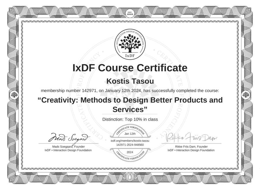 The IxDF Course Certificate above is awarded to Kostis Tasou with a Top 10% Distinction in formal recognition of their coursework surpassing the rigorous benchmarks of exceptional performance established by the IxDF Educational Codex.