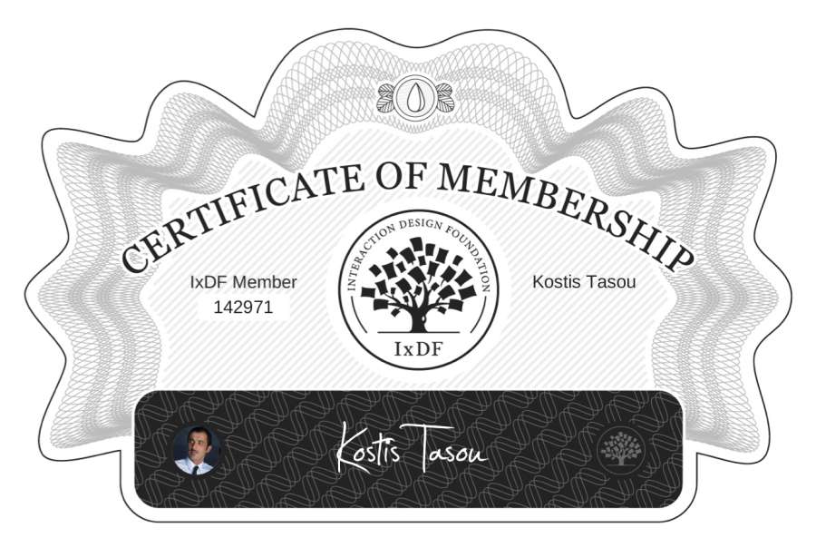 The Membership Certificate below verifies that Kostis Tasou is a member of Interaction Design Foundation.