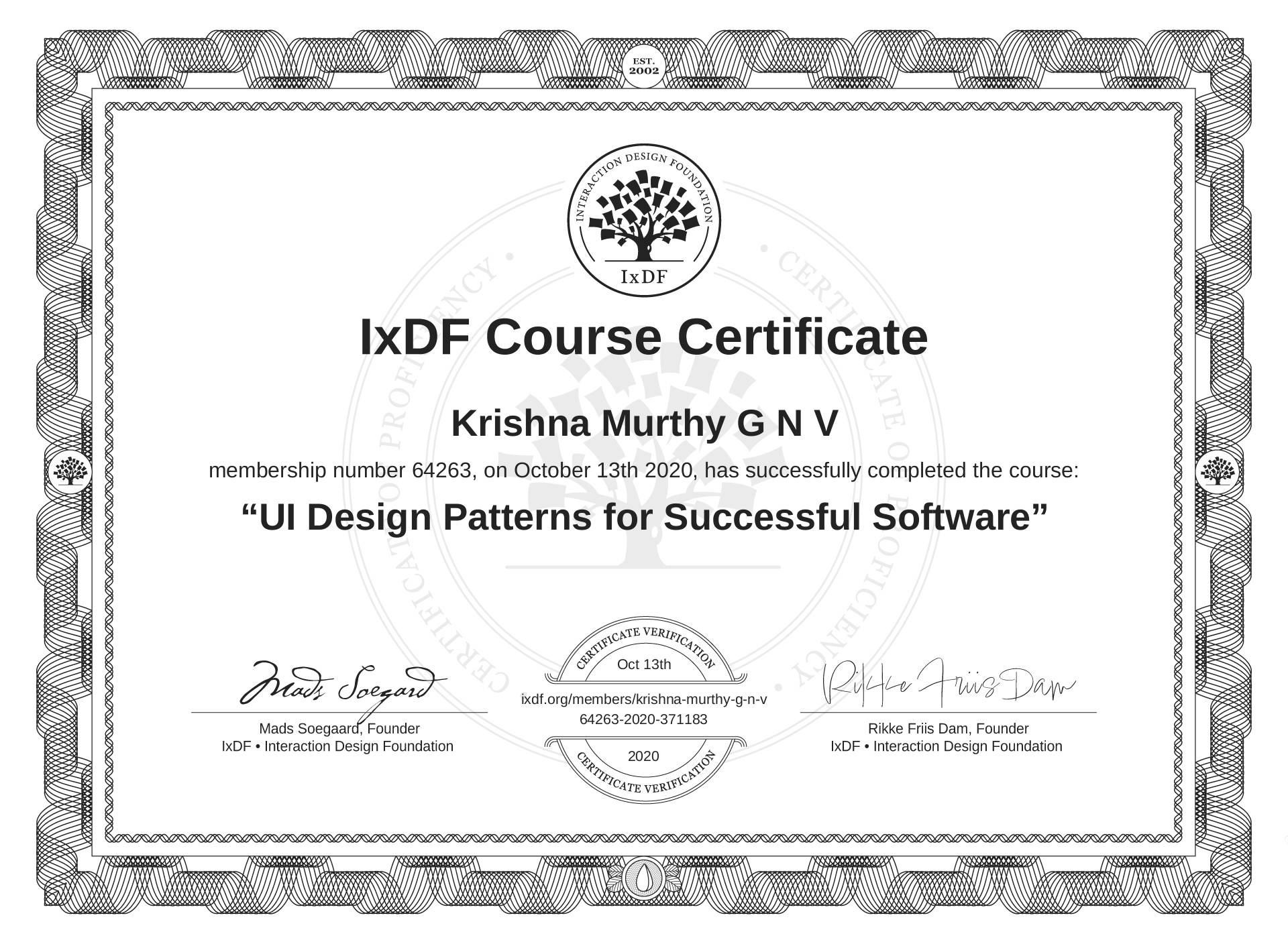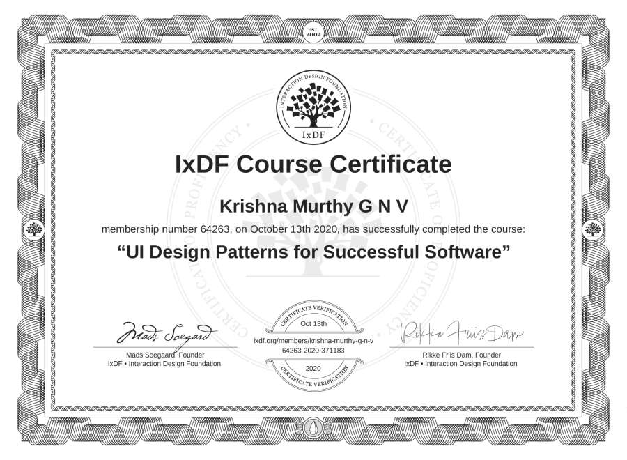 Krishna Murthy G N V's IxDF Course Certificate: UI Design Patterns for Successful Software