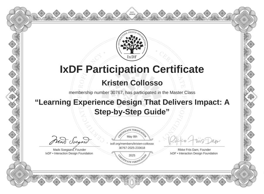 Kristen Collosso's IxDF Masterclass Certificate: Learning Experience Design That Delivers Impact: A Step-by-Step Guide