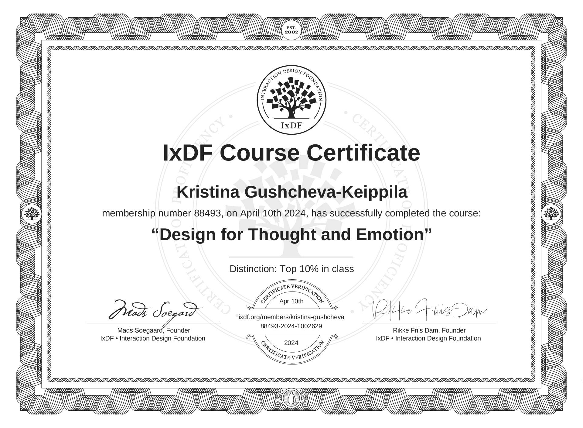 The IxDF Course Certificate above is awarded to Kristina Gushcheva-Keippilä with a Top 10% Distinction in formal recognition of their coursework surpassing the rigorous benchmarks of exceptional performance established by the IxDF Educational Codex.