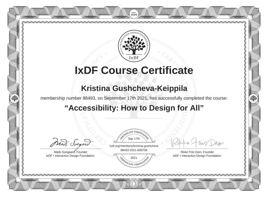Kristina Gushcheva-Keippilä's IxDF Course Certificate: Accessibility: How to Design for All