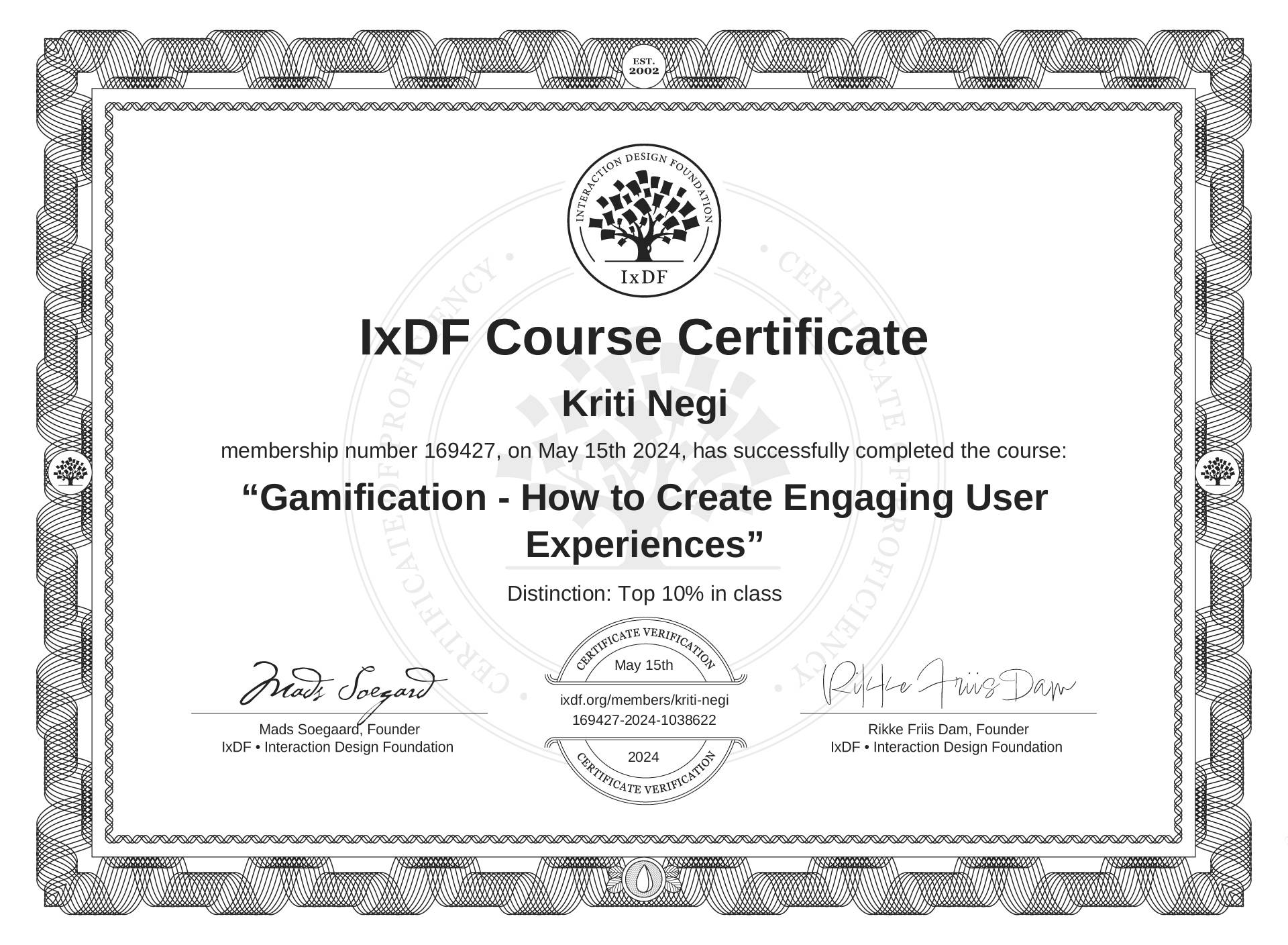 The IxDF Course Certificate above is awarded to Kriti Negi with a Top 10% Distinction in formal recognition of their coursework surpassing the rigorous benchmarks of exceptional performance established by the IxDF Educational Codex.