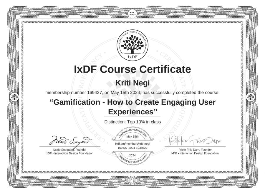 Kriti Negi's IxDF Course Certificate: Gamification - How to Create Engaging User Experiences