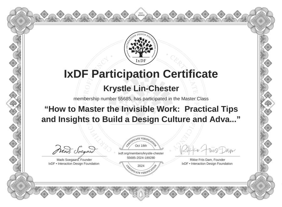 Krystle Lin-Chester's IxDF Masterclass Certificate: How to Master the Invisible Work: Practical Tips and Insights to Build a Design Culture and Advance Your Career