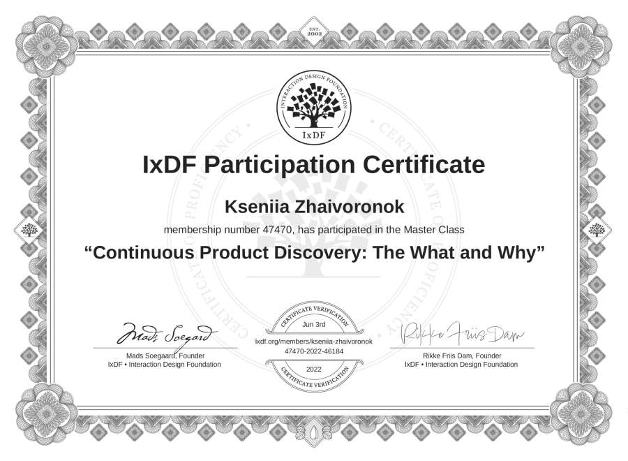 Kseniia Zhaivoronok's IxDF Masterclass Certificate: Continuous Product Discovery: The What and Why