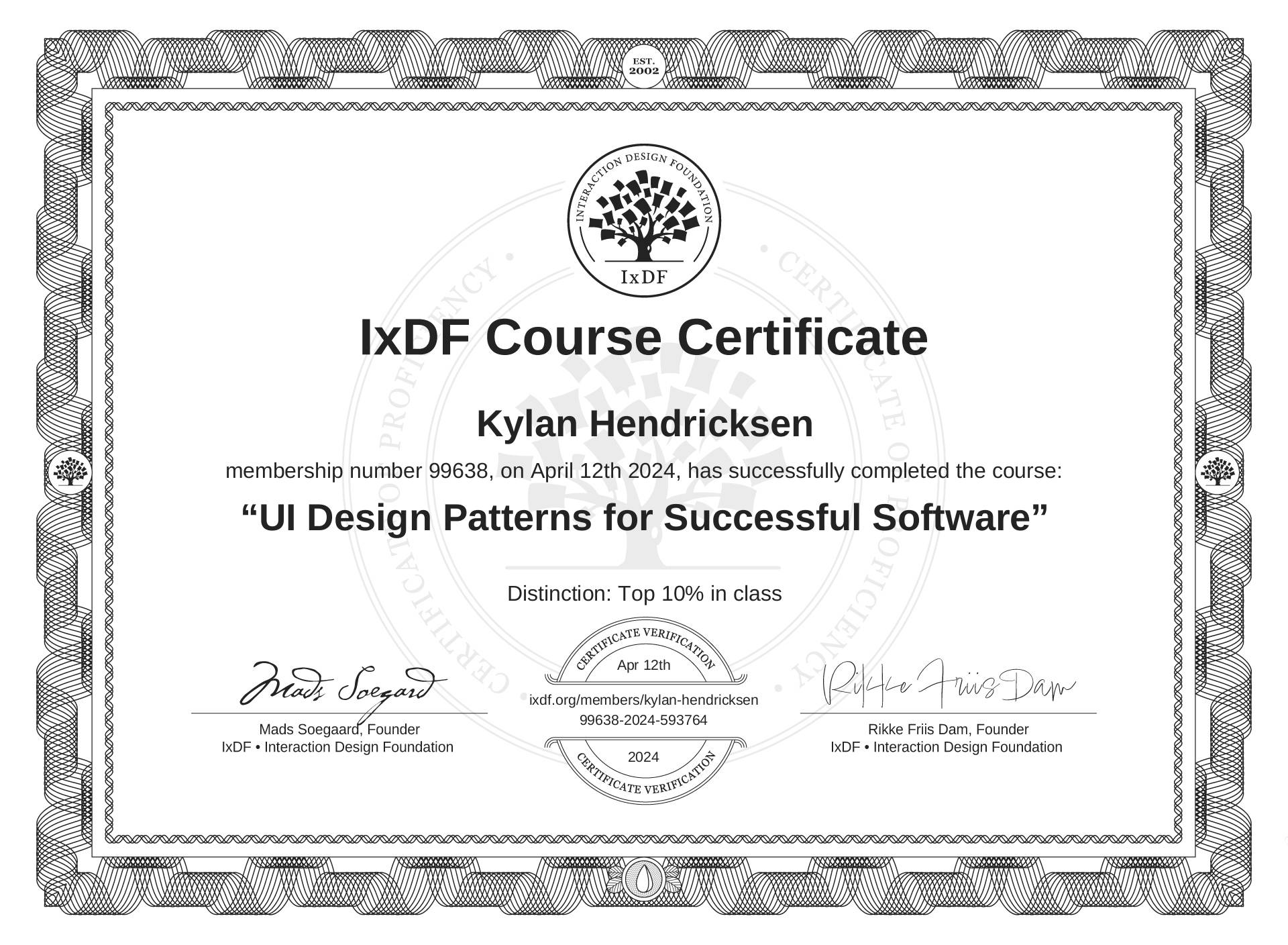 The IxDF Course Certificate above is awarded to Kylan Hendricksen with a Top 10% Distinction in formal recognition of their coursework surpassing the rigorous benchmarks of exceptional performance established by the IxDF Educational Codex.