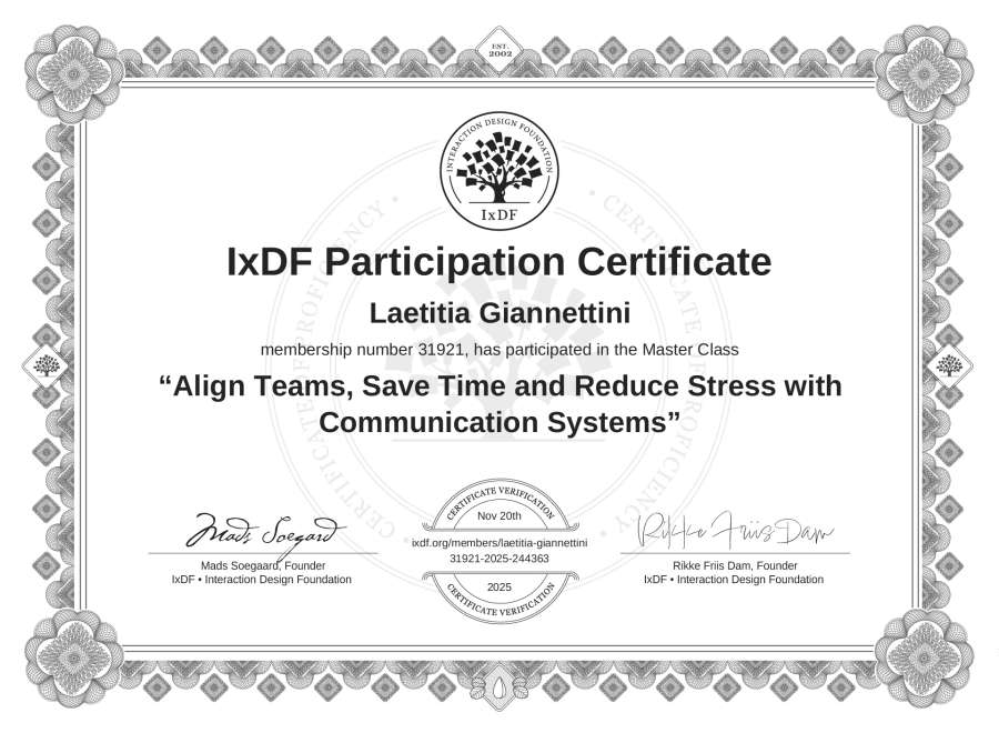 Laetitia Giannettini's IxDF Masterclass Certificate: Align Teams, Save Time and Reduce Stress with Communication Systems