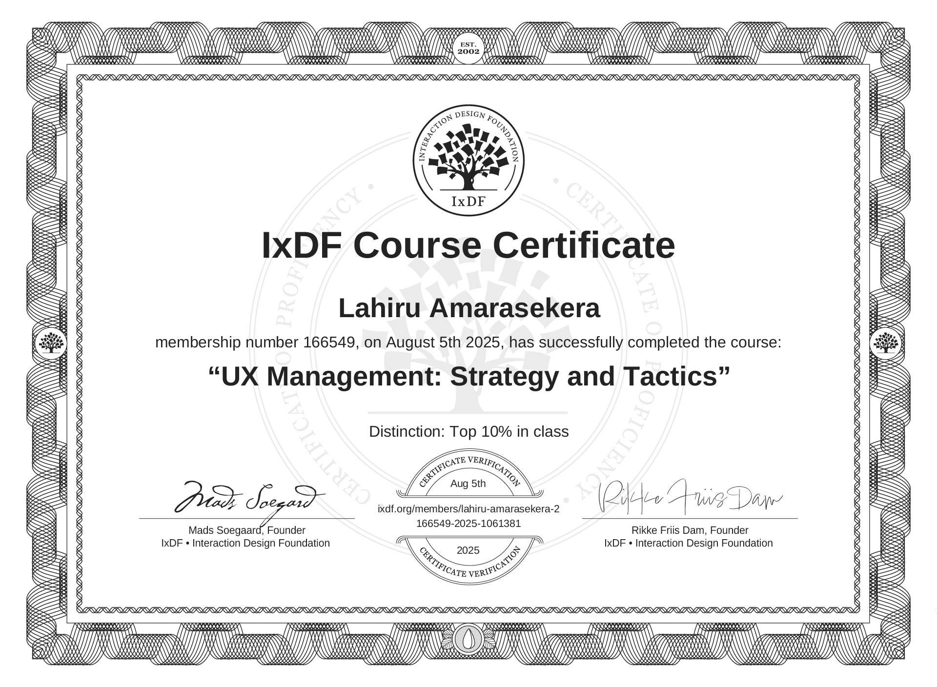 Lahiru Amarasekera's IxDF Course Certificate: UX Management: Strategy and Tactics