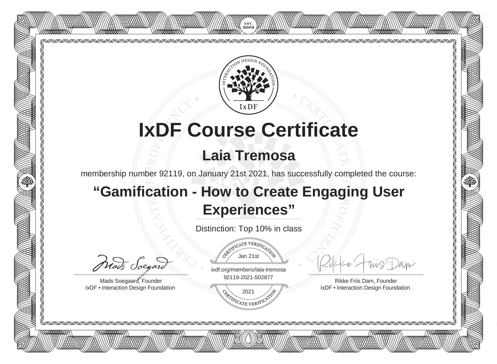 Laia Tremosa's IxDF Course Certificate: Gamification - How to Create Engaging User Experiences