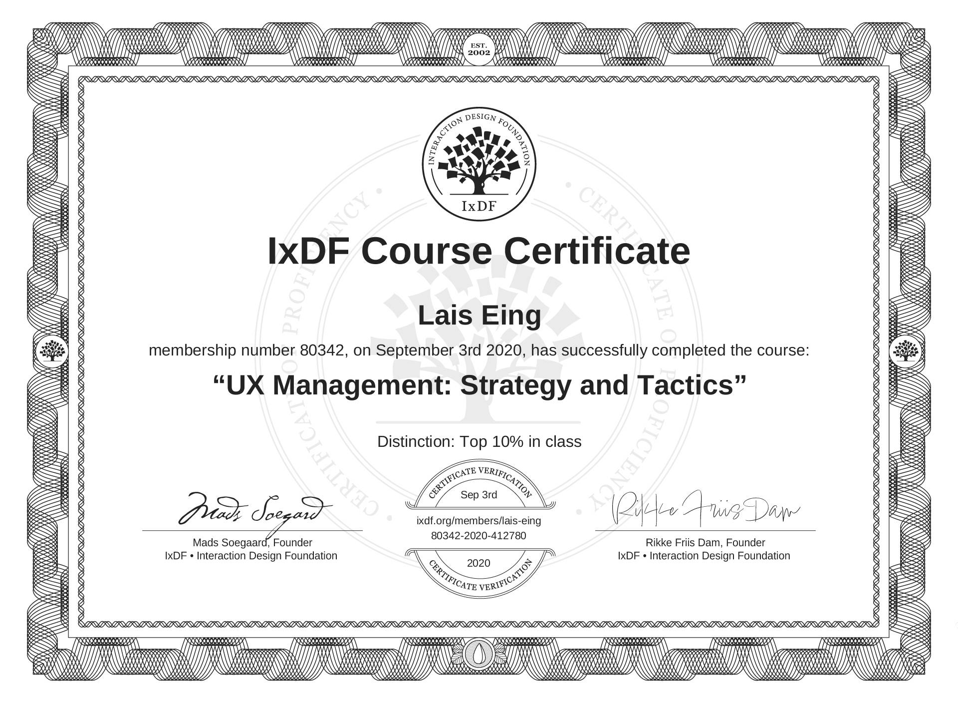Lais Eing's IxDF Course Certificate: UX Management: Strategy and Tactics