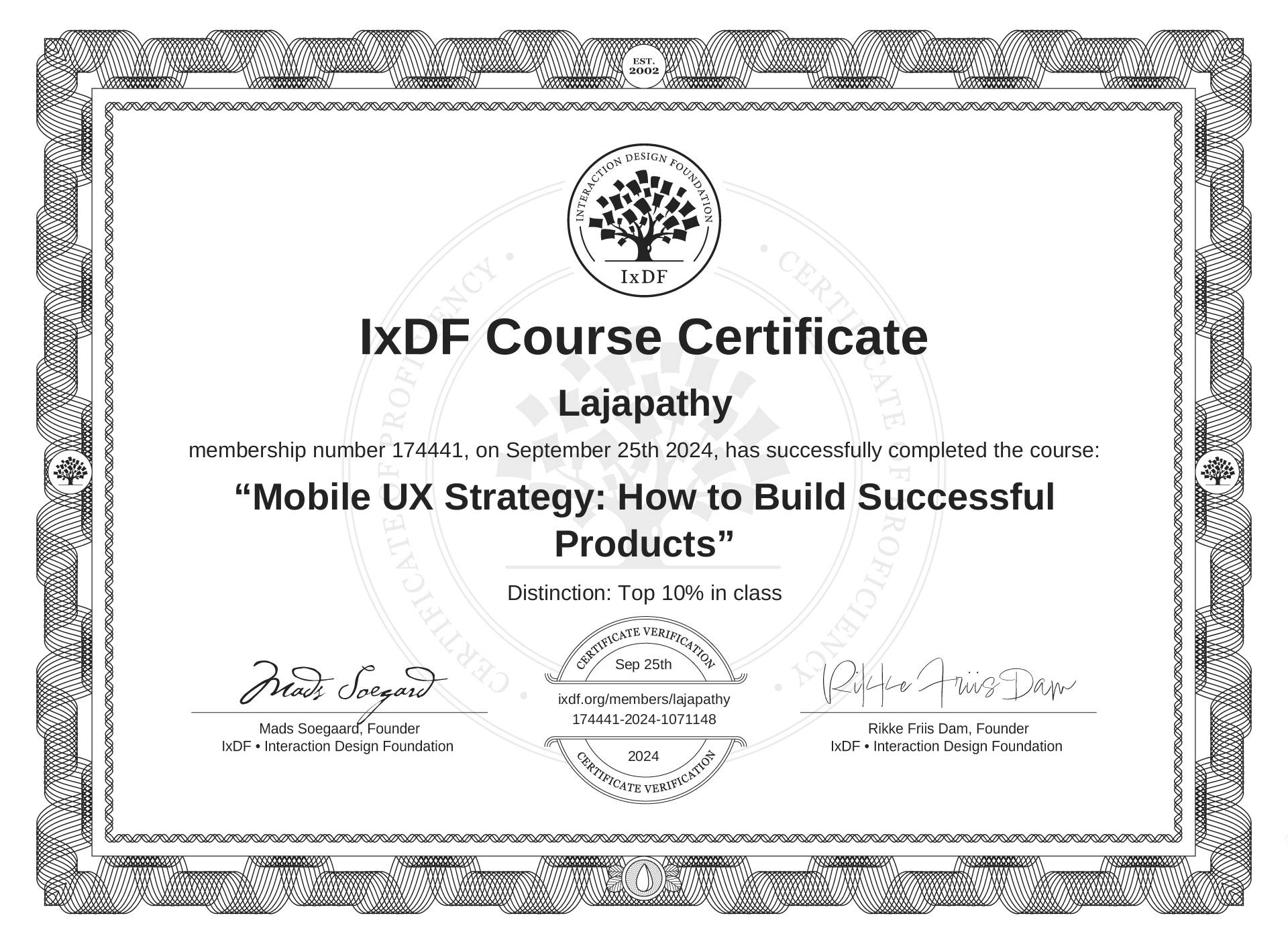 The IxDF Course Certificate above is awarded to Lajapathy with a Top 10% Distinction in formal recognition of their coursework surpassing the rigorous benchmarks of exceptional performance established by the IxDF Educational Codex.