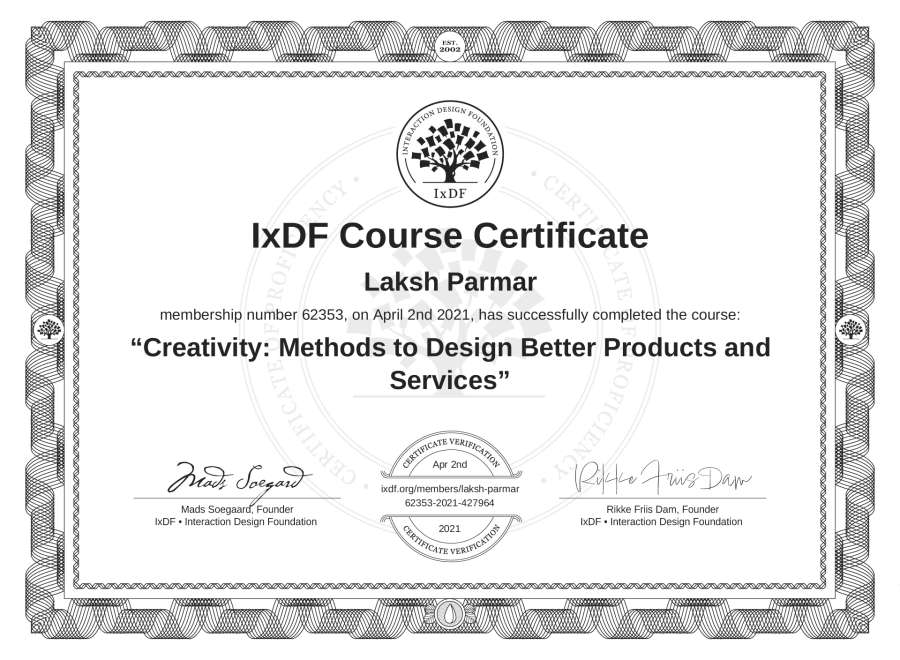 Laksh Parmar's IxDF Course Certificate: Creativity: Methods to Design Better Products and Services