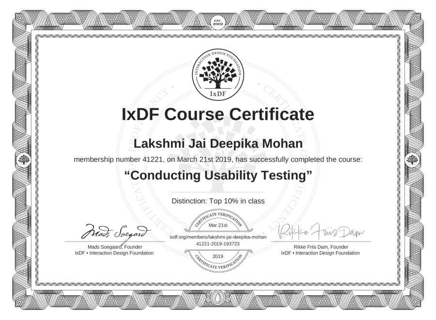 Lakshmi Jai Deepika Mohan's IxDF Course Certificate: Conducting Usability Testing