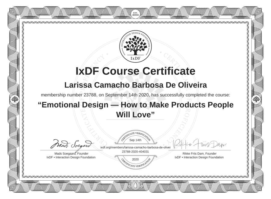 Larissa Camacho Barbosa De Oliveira's IxDF Course Certificate: Emotional Design — How to Make Products People Will Love