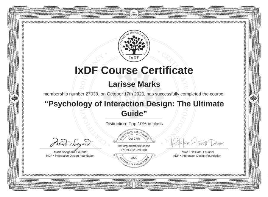 Larisse Marks's IxDF Course Certificate: Psychology of Interaction Design: The Ultimate Guide