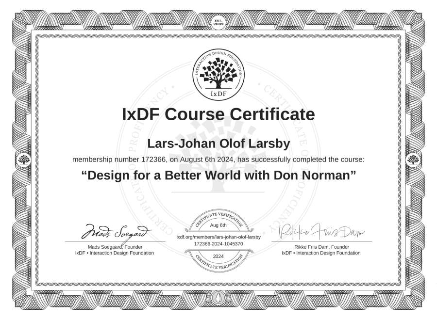Lars-Johan Olof Larsby's IxDF Course Certificate: Design for a Better World with Don Norman